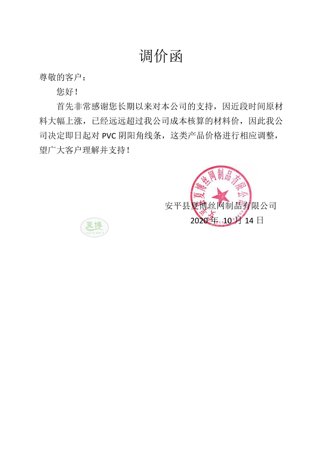 安平縣夏博絲網(wǎng)制品有限公司關(guān)于陰陽角調(diào)價的通知
